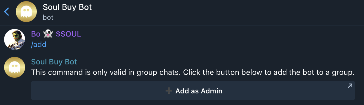 For users returning to [Soul Buy Bot](https://t.me/soul_buy_bot) they can add the bot to a new group through various ways